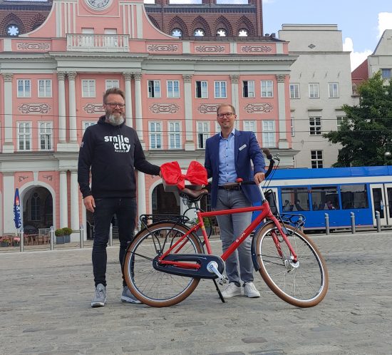 Bessere Daten für den Radverkehr in Rostock und MV – OSPA fördert Radzählgerät für die Arbeitsgemeinschaft fahrrad- und fußgängerfreundliche Kommunen (AGFK MV) Vor dem Rostocker Rathaus hat heute Claus Ruhe Madsen (Vorsitzender AGFK MV) ein mobiles Radzählgerät von Karsten Pannwitt (Vorstandsmitglied OSPA) entgegengenommen. Neuer Besitzer des