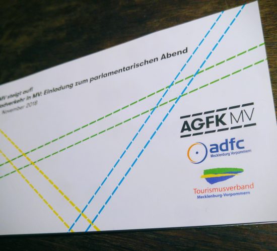 Am Dienstag, den 13. November 2018 betritt die AGFK MV zum ersten Mal die große politische Bühne. Anlass ist ein Parlamentarischer Abend, der gemeinsam mit dem Tourismusverband Mecklenburg-Vorpommern sowie dem ADFC Landesverband Mecklenburg-Vorpommern ausgerichtet wird.